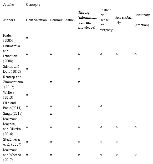 Considering the objective of developing a framework on how shadow IT usage may influence collaboration, this stage of analysis consists of looking for the categories listed a priori in the articles chosen as relevant, in other words, concepts related to collaboration and communication, as well as to elements of Social Presence Theory. As can be observed in Table 3, not all the articles had a central focus on collaboration and communication. However, they all approach the use of unauthorized technology and, in some measure, touch on concepts related to communication and SPT. Table 4 presents the analysis of the concepts related to collaboration and SPT found in the articles.