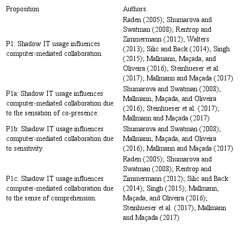 As demonstrated in Figure 1, the framework presents how shadow IT usage can influence computer-mediated collaboration based on Social Presence Theory. To drive the analysis, proposals referring to the framework were formulated based on the literature studied, which are presented in Table 5.