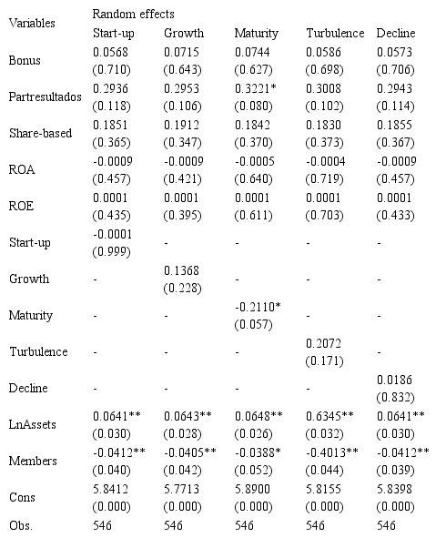 In addition to the assets variable, from Table 4 it can be seen that in the start-up, growth, turbulence, and decline phases, the number of members of the statutory board was significant at 5%, but in an inverse relationship with executive compensation; that is, the higher the number of members, the lower the remuneration. This result confirms those in previous studies; for example, Ventura (2013). In the maturity phase, the number of members resulted in the same behavior but was significant at 10%.