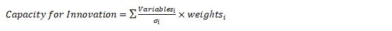 (03)However, innovation is formed by several variables, and is defined by Santos et al. (2014) as comprising the nine variables described in the Materials section. Thus, the capacity for innovation of each sector can be represented by formula 04: