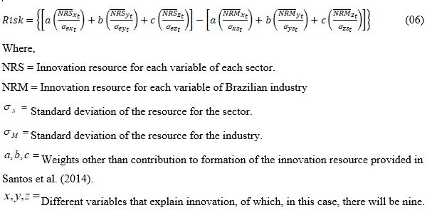 (06)Santos et al. (2014) evaluated the impact of investments in innovation on company performance and, by extending the proposed conceptual model to the capacity to innovate, the authors identified the relative influence of each dimension on business performance. This evaluation contrasts a model proposed by the Brazil Index of Innovation carried out by Campinas State University, which is not currently being updated. The proposal suggests that the risk of the sector’s innovation strategy takes into account the position of the innovation capacity level of each sector (divided by the standard deviation of the resource) in relation to the industry average (divided by standard deviation of the sector); the resource is calculated by the weighted average of the influence of each variable (Formula 06).