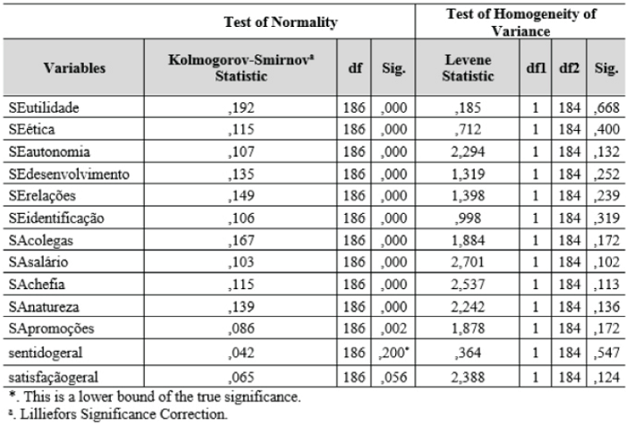 In order to investigate a possible relationship between the constructs sense of work and job satisfaction, before starting the statistical analyzes of correlation and regression, it was necessary to examine the normality and homogeneity of the data variance, in order to choose the most suiBox parametric or non-parametric methods for the sample. For this, the Kolmogorov-Smirnov tests and the Levene test, respectively, presented in Box 1, were performed. It is worth clarifying that the variables whose names begin with SE refer to the six dimensions of the senses of work, as proposed by the MWS, while the variables with names beginning in SA refer to the five dimensions of job satisfaction, as proposed by JSS. The variables “sentidogeral” and “satisfaçãogeral” refer to the average scores achieved by the senses of work and job satisfaction, respectively.