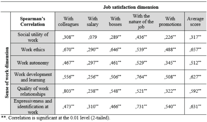 Therefore, it was decided to correlate the six dimensions of sense of work - social utility of work, work ethics, work autonomy, work development and learning, quality of work relationships and expressiveness and identification at work - with the five dimensions of job satisfaction - with colleagues, with salary, with bosses, with the nature of the job and with promotions, as well as with the average job satisfaction score itself. This procedure aimed to facilitate the approach to the subject at the time of the interviews.