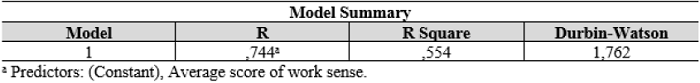 For the linear regression analysis, therefore, the least squares method was used, the default method of the SPSS program, which consists of finding “the best possible line to describe the data set, minimizing the differences between the model adjusted to the data and the data themselves” (Field, 2009, p. 160). Box 3 provides the summary of the model with the values calculated for R and R2, in which it is possible to verify that the correlation between the sense of work and job satisfaction showed a high association strength (r = 0.744, p <0 .001), the sense of work being able to explain 55.4% of the variation in job satisfaction. This means that, although there are probably other variables capable of explaining the variation in the level of satisfaction of the employee with the work, only the sense of work is sufficient to explain 55.4% of this variation and, therefore, all other variables would not influence more than 44.6% of it.