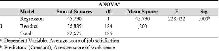 The output that reports the analysis of variance (ANOVA), presented in Box 4, presents the result of comparing the amount of explained variance with the variance not explained by the model. Considering the value obtained from F = 228.42, p < 0.001, it can be said that the regression model proved to be highly significant when using the sense of work to predict the levels of satisfaction of servants with work.