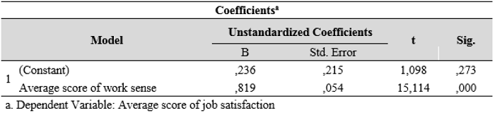 As Field (2009) points out, it is worth noting that although the correlation coefficients (r) and determination (r2) are useful measures to assess the relationship between variables and the degree of importance of an effect of one variable on the other, they cannot be used to infer any cause and effect relationships. Therefore, despite the analysis of the correlation coefficients between the dimensions presented here, they suggest a statistically significant relationship between the senses of work and job satisfaction, it was necessary to resort to the simple linear regression technique in an attempt to achieve the general objective of this study, seeking a possible effect of the senses of work on job satisfaction. Hair Junior et al. (2005) state that, although bivariate regression and correlation analysis are the same, only the regression technique is able to examine the information about the relationship between the independent variable and a dependent variable to, from there, make predictions about its behavior.