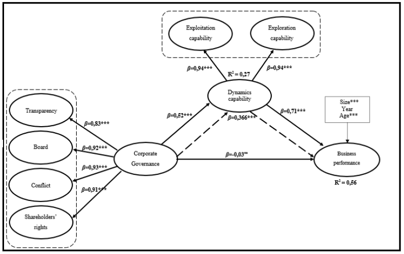 Findings: Confirmed the direct and positive effect of CG on DC development, as well as DC’s influence on BP and the mediating effect of DC on the CG - BP relationship. The main conclusion was that DCs are a powerful mediating influence on the CG-BP relationship. Hence, even with efficient corporate governance mechanisms, the companies must make decisions in line with their dynamic capabilities as a way to reach better business performance.