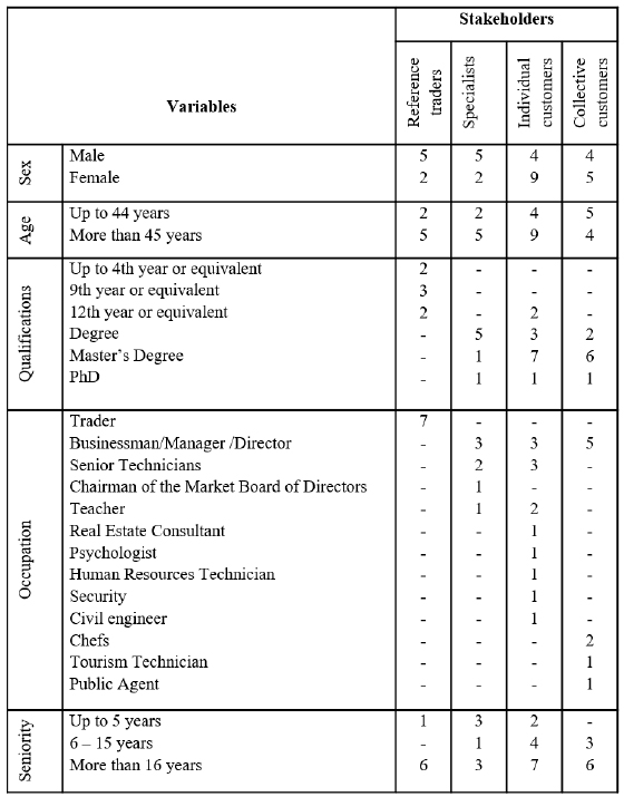 The sample under study consists of a total of 36 professionals, market related stakeholder groups, previously identified by market management: reference traders (7), specialists (7), individual customers (13), collective customers/tourist agents (9). Respondents were considered individually (not grouped) to ensure the assumption of independent comments. The characterization of respondents is presented in table 1.