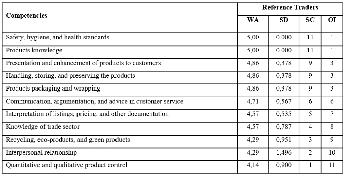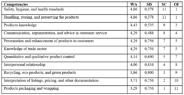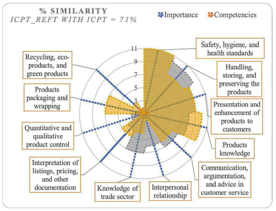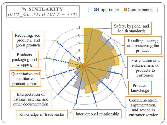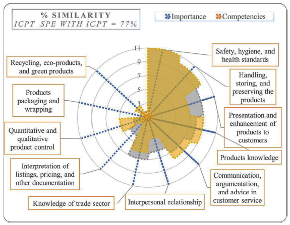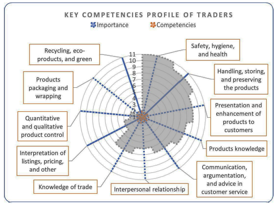 Through ordering the relative importance of the identified competencies it was possible to obtain the ideal competencies profile of the trader, with results highlighting the greater appreciation of skills, related to knowledge of safety, hygiene and health standards and the lesser appreciation of skills related to recycling, eco-products, and green products. Each of the competency’s profiles, identified by the involved groups, was subsequently compared to the ideal competencies profile of the trader, evidencing the high percentages of similarity obtained in this process - over 70%.