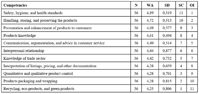It can be concluded that competence in the knowledge and application of safety, hygiene, and health standards has obtained the highest average (4.86) and is thus ranked first in the ICPTcl, with convergence of opinion with the group of experts as it is the most valued skill in both profiles. The importance of this skill, of the hard domain, reinforces the postulated by Ruivo e Carvalho (2017) and CMS (2013) for whom this skill is the cornerstone of the quality and efficiency of the function of trader.