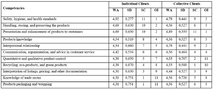 The importance given by individual clients to the ability to handle, store and preserve products (2nd place with 4.69 for individual clients) should also be highlighted. It is also worth mentioning the importance of soft competence related to the ability to communicate, argue, and advise in customer service (6th place with 4.42 for individual customers; 4th place for collective customers with 4.56), which in a way, it shows a privileged positioning of this type of competences more directly related to behaviour and attitude. At the same time, emphasis should also be placed on the lower importance given to competence related to recycling, eco-products and green products (8th place with 4.38 for individual clients; 10th place for collective clients with 4.33), corroborating those who consider this to be one of the differentiating competences of this type of professionals (Crawford et al., 2018; Darolt et al., 2016) - its weak valuation and operationalization make it a true strategic differential.