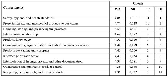 At this level, some similarities can be identified. First, greater appreciation of hard skills (Darolt et al., 2016) by both groups, reinforcing what has already been previously noted for specialists: safety, hygiene, and health standards (1st place with 4.92 for individual clients; 2nd place for collective clients with 4.78) and presentation and appreciation of products to customers (2nd place with 4.69 for individual clients; 1st place for collective clients with 4.89).
