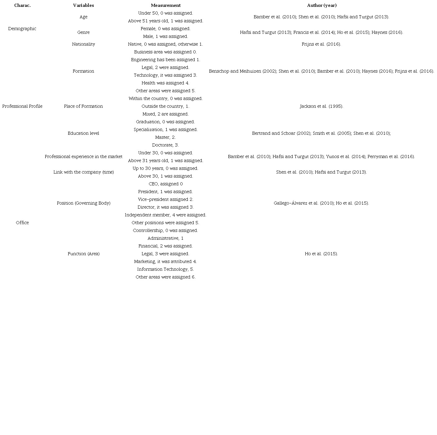 The increase in the complexity of the business has raised the importance of the role of managers of the governing body in organizations. It is essential to explore and investigate the characteristics and skills of these managers (Duong & Evans, 2016). In a meta-analysis carried out by Haynes (2016), the authors argue that the characteristics of the managers’ profile are related to accounting, as it provides support for organizational decision-making. Studies related to diversity must analyze demographic aspects and the formation of the governing body, as this can lead to different consequences in decision making (Jackson et al., 1995).