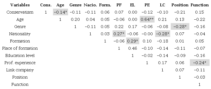 According to Table 2, there is a relationship between the dependent variable (accounting conservatism) and the independent variables. However, this relationship was only obtained for the variable related to the age of managers who make up the board of directors of Brazilian companies (-0.14). This result reveals that, in the Brazilian sample, younger managers tend to be less conservative. In the correlation of independent variables, age is positively and moderately related to professional experience (0.64).