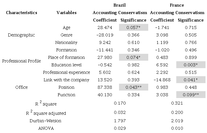 The different results obtained for Brazilian and French companies, given the themes analyzed, reveals that in Brazil what determines conservative accounting practices is the age of the governing body, its place of formation and the position held in the governing body. In French companies, on the other hand, the determining factors for the occurrence of practices focused on accounting conservatism are related to the level of education of the governing body, link with the company and the function performed/area of activity. Such determinants may be linked to the culture of each country, the way in which companies conduct their work in the governing body, among other factors linked to the maximization of company profits.