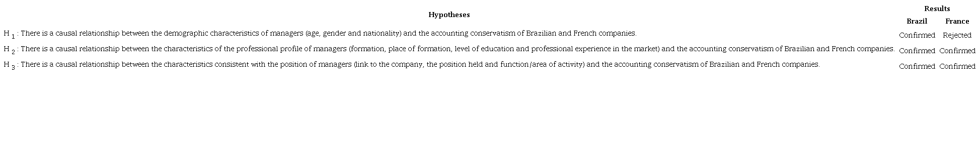 H1: There is a causal relationship between the demographic characteristics of managers (age, gender and nationality) and the accounting conservatism of Brazilian and French companies.