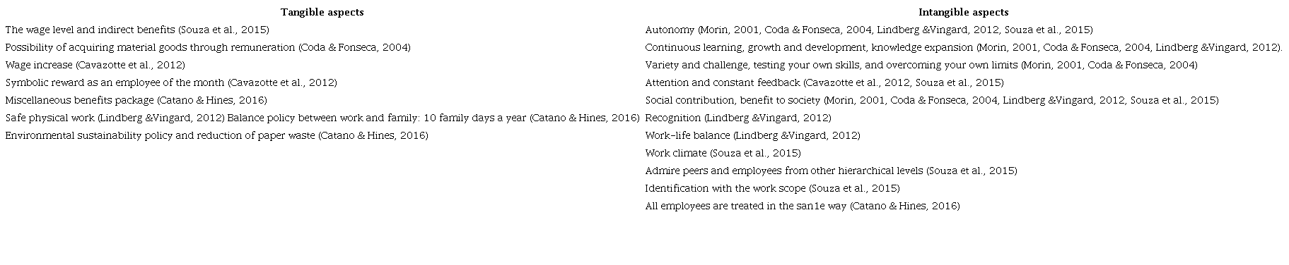 Based on the definitions presented, in this work the tangible aspects that contribute to making the workplace an excellent place to work include objective factors such as remuneration, benefits, or concrete policies. Intangible aspects, however, concern untouchable factors, such as autonomy, recognition, motivation, balance between personal and professional life, good working climate, among others. These tangible and intangible aspects will be discussed below.