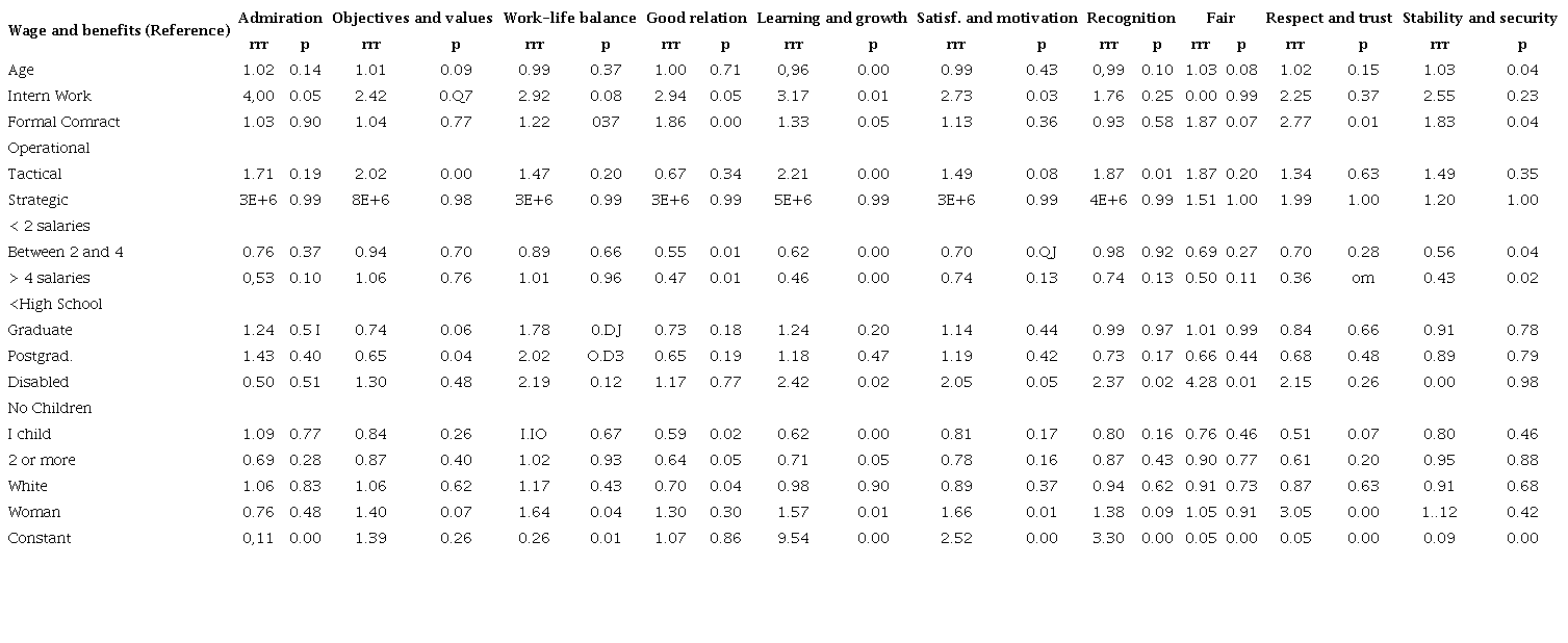 When the wage moderates the gender variable, we further observe a preference for intangible reasons by women, specifically women who earn more than four minimum wages at the expense of those who earn a maximum of two. This women profile is 3.5 times riskier when the intangible aspect is to agree with the company’s goals and values (p = 0.04), five times when we analyze the insertion in an environment of good relationships with colleagues (p = 0.05) and fifteen times when it comes to having respectable, trustworthy bosses who guide the work team (p = 0.03). The other moderations - not mentioned in the text - showed no significant difference between men and women. As previously discussed, we point that the profile characteristics can explain those differences of preference. The majority of the male workforce is focused on the operations of the construction sector. These low-income activities could impact to choose the company as a better place to work if their salaries increase. The women profile, nearest to the described in the last paragraph, with higher education levels, hides a better social condition that enables to prefer intangible aspects than the tangible ones.