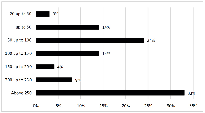 We found out that become member of cooperatives is often passed down from generation to generation, which may indicate that members understand cooperation as convenient in many senses. The annual gross income ranged between R$ 150 thousand (55%) and R$ 250 thousand (33%) (Figure 1).