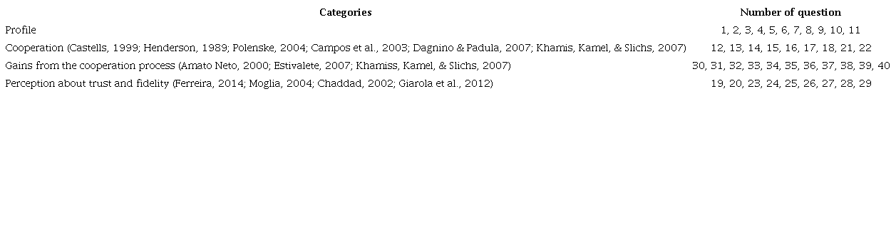 Data was collected in universities, cooperatives, farms, and agricultural fairs. All participants had access to the free and informed consent form. There were 40 open-ended and closed-ended questions (see chart 1 below). The closed-ended questions aimed to identify degrees of cooperation. The definitions very high, high, regular, low, very low, and do not trust were used. For trust perception, fidelity, profits and lack of cooperation, the levels: highly important (1), very important (2), more or less important (3), not very important (4) or not important (5).