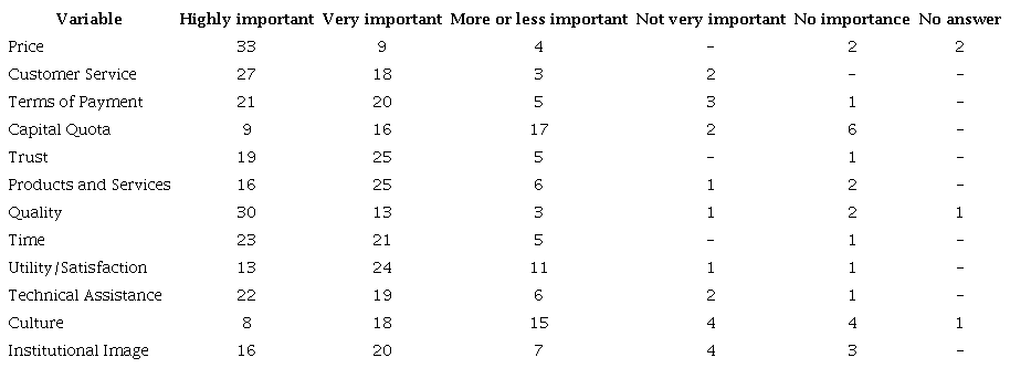 Regarding the aspects that influence the loyalty of the members, price and quality received most of the indications as highly important. Variables such as customer service, technical assistance and payment terms were concentrated in the highly important or very important grades, followed by the variables trust, products and services, and institutional image.