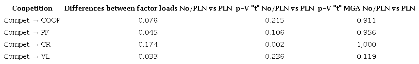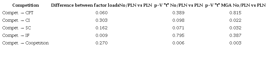 The results of the differences of the factor loads of the planned and unplanned clusters were: concerning the construct Competition with CPT (0.060), CI (0.303), SC (0.162), IF (0.009) and the Coopetition (0.270), being that the relationship of the Competition with the CPT is not statistically significant in both clusters, because the Student “t” and the MGA were greater than 0.05.