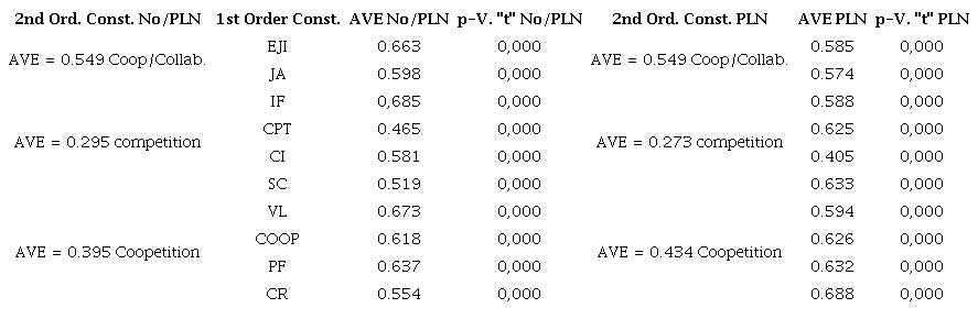 The Table 01 also illustrates that the proposed model does not converge to a satisfactory result regarding the second-order constructs as the Competition, Cooperation/Collaboration and Coopetition, because only the Cooperation/Collaboration in the unplanned clusters with AVE=0.549 meets the indications of Prearo (2013) and Ringle, Silva & Bido (2014), which should be greater than 0.5. The second-order constructs, in both the clusters, presented AVE with values below 0.50. As to the first-order constructs, we can see that CPT has not met the theory in the unplanned clusters, but has met in relation to the planned clusters, because the AVE value was 0.625. The construct CI comply with the theory in the planned clusters with AVE= 0.581. The other constructs of first order, JA, COOP, SC, IF, PF, CR, EJI and VL comply with AVE from 0.50 in both clusters.