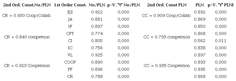 We can notice that in the Table 01 both the second-order constructs as the Cooperation/Collaboration, Competition and Coopetition, as the first order constructs are statistically significant, because in all the cases the “t” test has significance (p ≤ 0.05), meeting the referral made by Hair Jr. et al in both clusters. (2009) and Prearo (2013).
