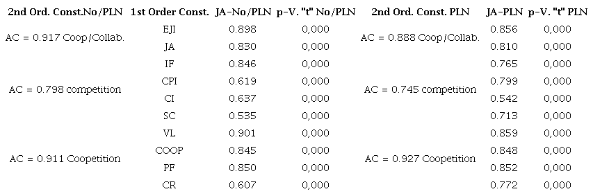 The results obtained from the bootstrapping illustrated in Table 05 concerning the Cooperation/Collaboration second-order construct with the construct of the first-order, JA, present a higher factor load in the unplanned clusters (0.908) and in the planned clusters (0.902). The same occurs with the construct EJI, with higher factorial load in the unplanned clusters (0.947) than in the planned ones (0.935). These results are different as regards the Cooperation/Collaboration in relation to the Coopetition, being the factorial load of 0.562 in the planned clusters and 0.297 in the unplanned ones. These results are statistically significant in both clusters (sig < 0.05), as we can see in the Table 05.
