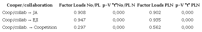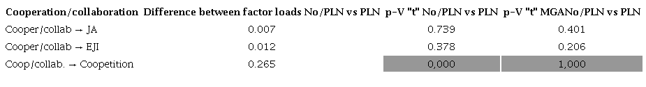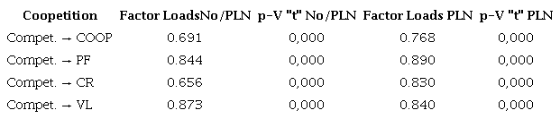 In the Table 9, although the results show that there is a difference in the relation with the constructs with COOP, PF, CR and VL, the difference of the factor loads, illustrated in the Table 10 and analyzed by the “t” Student and MGA, shows that these results are not statistically significant, because the difference of the factor loads of the Coopetition comparing with the constructs COOP (0.076), PF (0.045) and VL (0.033), showed a significance greater than 0.05 (sig > 0.05).