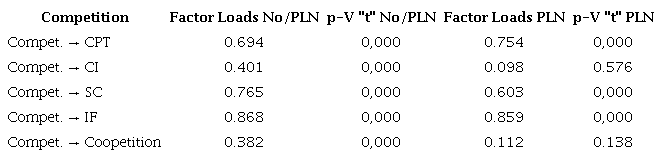 The Competition in relation to the Coopetition prevailed in the unplanned Competition with factor load of 0.382, which proved to be significant. However, in relation to the planned clusters, the factorial load of 0.112 was not significant (sig>0.05). We can observe in these results that the Competition in relation to the constructs, CI, SC and IF and Coopetition occurs more in the unplanned clusters and the Competition with respect to the construct CPT occurs more in the planned clusters.