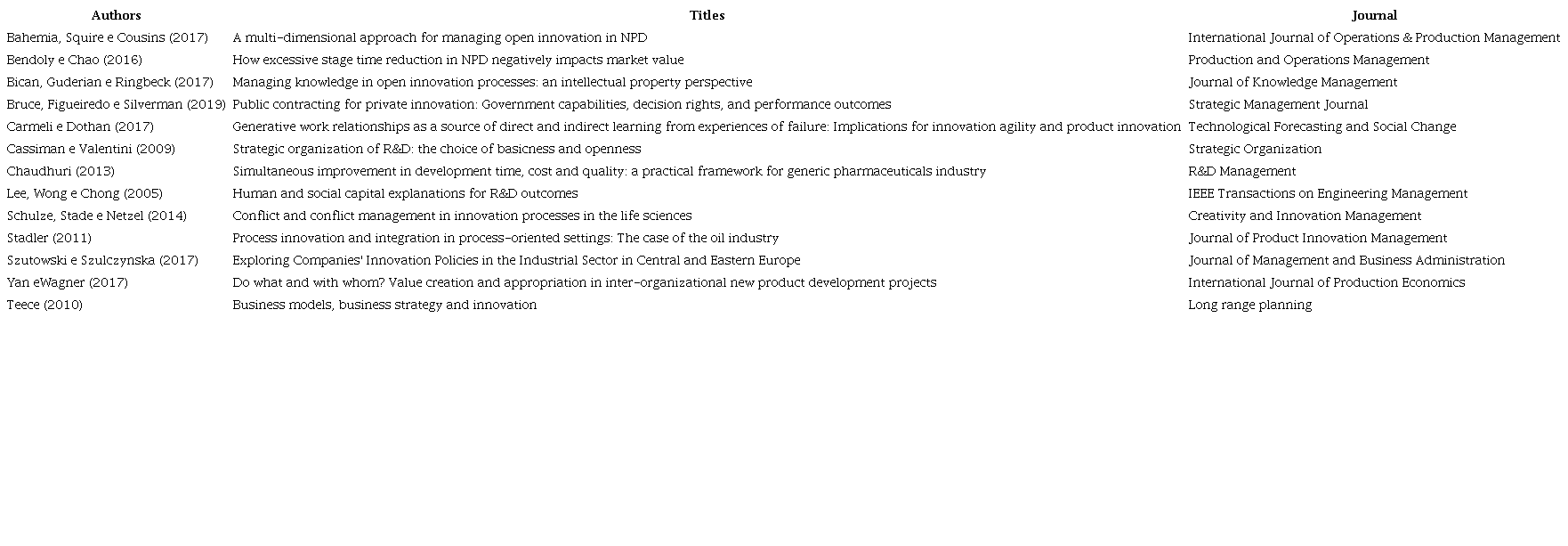 Among the publications where research & development, innovation and intellectual property are concentrated (Bahemia, 2017; Bendoly & Chao, 2016; Bican, 2017; Bruce, 2019; Carmeli & Dothan, 2017; Cassiman & Valentini, 2009; Chaudhuri, 2013; Lee, 2005; Stadler, 2011; Szutowski & Szułczyńska, 2017; Teece, 2010; Yan & Wagner, 2017), we have as an exhibition the research by Szutowski and Szułczyńska (2017) which proved that an innovation policy guarantees a continuous process of generating small improvements, which leads to successful innovation. Bahemia et al. (2017), developed and tested a measurement scale to test hypothetical relationships between openness, product innovation, product competitive advantage and appropriability regime. This author concluded that product innovation has a direct positive relationship with the product's competitive advantage. The results presented by Chaudhuri (2013) show that products with varying levels of complexity benefit from different degrees of standardization, optimization and collaboration to meet the multiple objectives associated with development. Stadler (2011), on the other hand, recommends that managers provide specialists with space to experiment for long periods of time, encourage cooperation between disciplines and create incentives and systems to facilitate the process of promoting innovation, while the study by Yan and Wagner (2017), helps managers understand what types of new product development tasks have the greatest potential for creating value. Concluding the debate, Bruce et al. (2019), states that cooperative agreements generate greater innovative production, which can be measured by patents and citations, controlling the endogeneity of the form of a contract when this is the case.