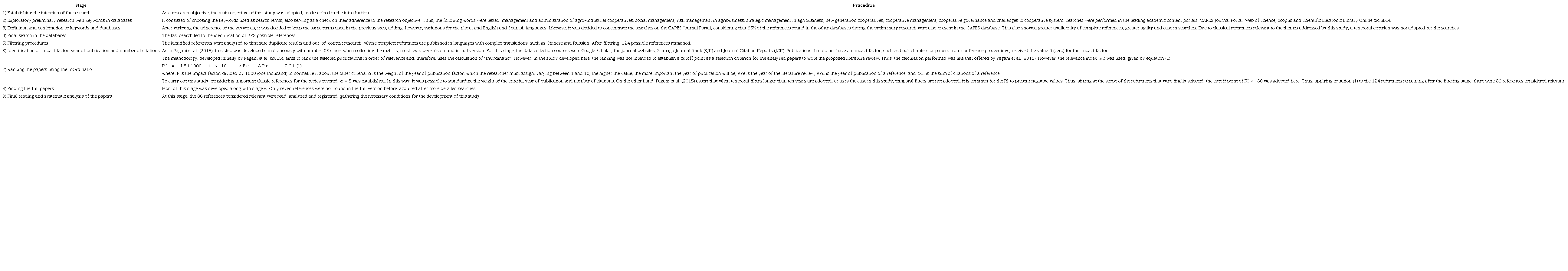 To carry out this study, a systematic literature review was done. Through the filter of relevance, we sought to identify references of national and international origin that addressed issues related to the management of cooperative agro-industrial enterprises. As a criterion for selecting references, we adapted the methodology developed by Pagani et al. (2015), called “Methodi Ordinatio”. This procedure consists of a sequence of nine steps (Table 1), allowing the identification and ranking, by relevance, of essential references within a given theme. Therefore, the methodology in question considers the metrics: impact factor, year of publication and number of citations.