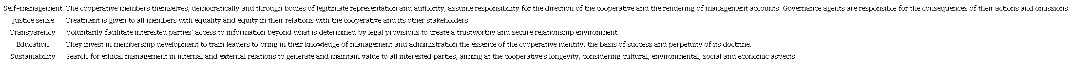 In this sense, good cooperative governance practices also gain importance, defined by the OCB (2015, p.13) as “a model of strategic direction, based on cooperative values and principles, which establishes ethical practices to ensure the achievement of social and ensure the management of the cooperative sustainably in line with the interests of the members”. Good cooperative governance practices aim to create a professionalized and transparent management structure, in line with the principles of cooperative system and cooperative governance (Table 3), which can be monitored by inspection and compliance bodies (in compliance with legislation and regulations). Thus, good cooperative governance practices play an essential role in the managerial evolution of cooperatives, especially for the agro-industrial segment, where there is no evidence of regulatory bodies, as is the case in the financial and health sectors, for example.