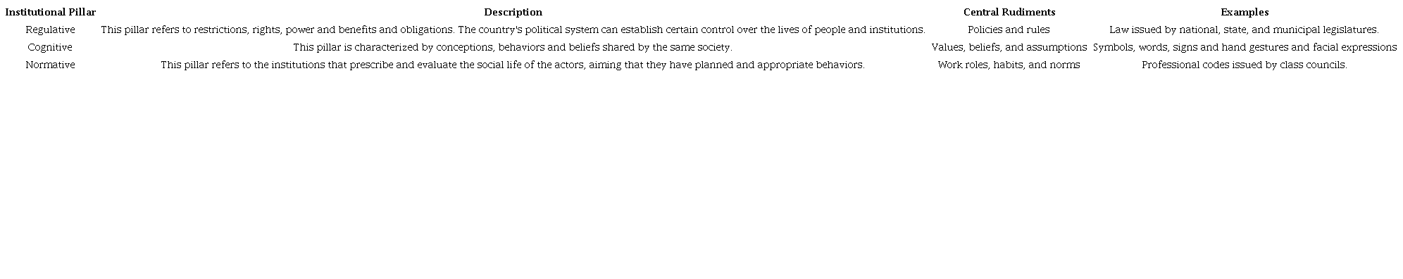 Scott (1995) lists three pillars (origins) of an institution: regulative, cognitive, and normative elements. The identification of the pillar on which an institution is based makes it possible to understand which national characteristics can influence business behavior and how these characteristics shape the relationship between organization and society. National institutions are composed of regulative, cognitive, and normative elements, which, together with associated activities and resources, provide stability and meaning to social life.