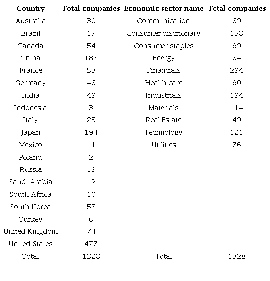 Japan and China also have a high representation in the sample with 194 and 188 companies, respectively, unlike countries like: Turkey, Indonesia, and Poland, with six, three and two companies, respectively. Table 2 shows that the sample operates within eleven industries. The industries with the largest representation are financial with 294 (22%) companies. Then, the industries with the highest representation are industrial and discretionary consumption with 194 (15%) and 158 (12%) companies, unlike industries like: real estate, energy, and communication.
