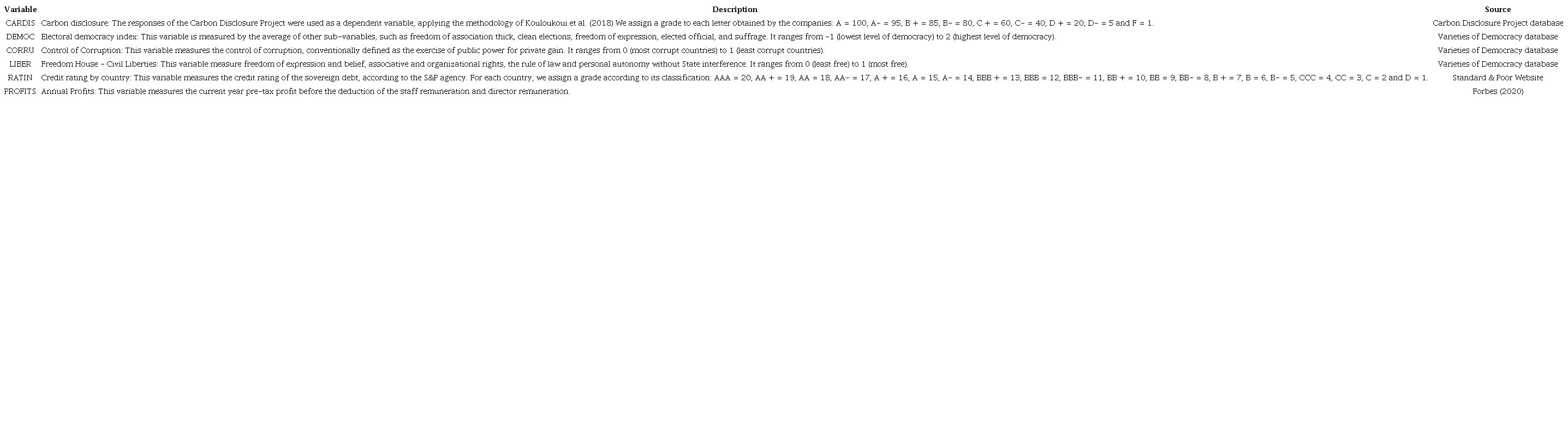 Two control variables were included in our empirical analysis: i) the credit rating by country was measured by assigning a score for each letter given by the Standard & Poor agency. We use the country risk variable because investors may demand carbon information when investing in riskier markets. Companies with less transparency of their emissions can get involved in environmental scandals, which reduces the profitability of investors; ii) the annual profits variable is recurrent in previous studies on carbon disclosure (Gallego-Álvarez et al., 2014; Grauel & Gotthardt, 2016; Luo, 2019). We do not adopt a control variable for the industry sector. The energy sector represents a small percentage of our sample, just 64 companies. In addition, we analyzed the world’s largest companies listed in Forbes (2020), which means that they have similar pressures for carbon disclosure.