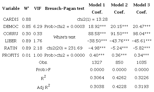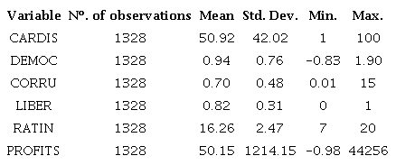 Regarding the independent variables, the DEMOC has, on average, a value of 0.76. The data show that the country with the weakest democracy has a value of -0.83 and the country with the strongest democracy has a value of 1.90. The CORRU (less corruption) has an average of 0.70, has a minimum of 0.01 and a maximum of 15. The LIBER has an average of 0.82, has a minimum of 0 and a maximum of 1. Regarding control variables, the data show that the RATIN has an average of 16.26 and PROFITS has an average of 50.15.