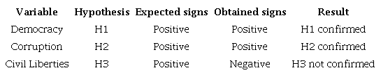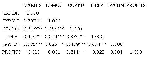 The data show that the DEMOC has a positive and significant correlation with the variables: CORRU, LIBER and RATIN. The CORRU has a positive and significant correlation with the variables: LIBER, RATIN and PROFITS. The LIBER has a positive and significant correlation with the variable RATIN. The data demonstrate that our dependent variable does not have a high correlation with any other variable under analysis. The variable that presented the least significant correlation with the others was profits, reaffirming the importance of having financial control variables at the company level.
