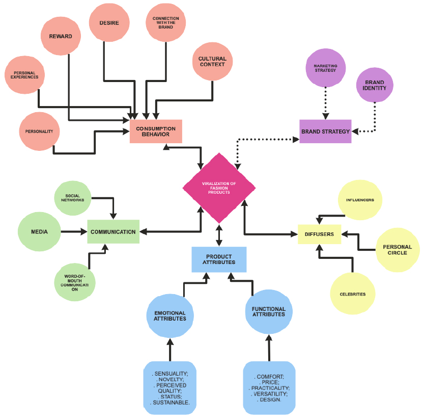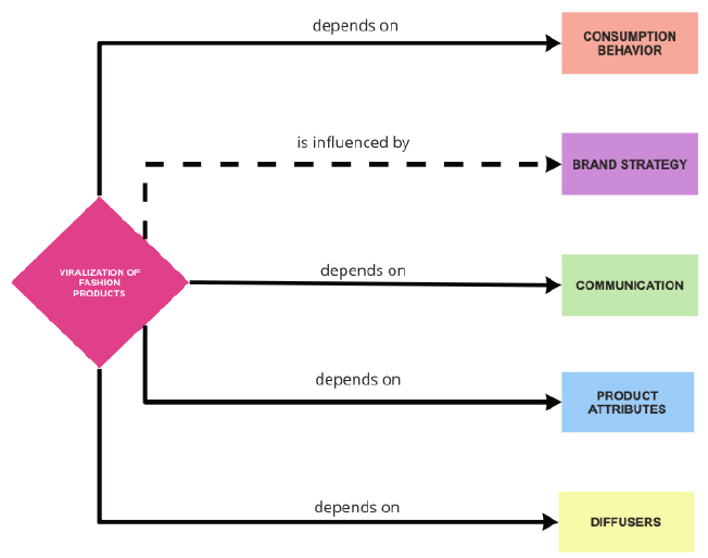 The viralization of fashion products depends on diffusers, communication, product attributes, and consumer behavior. This is a relationship of dependency because viralization is the result of communication by specific groups of people, the diffusers, who can be influencers, celebrities, or consumers’ personal circles. Moreover, the purchase decision - the behavioral factors that motivate consumers to acquire a certain product - is crucial for viralization to occur, since the phenomenon only happens when the product is adopted by a majority. In this way, product attributes are also relevant for consumption to occur and, therefore, this is a relationship of dependence.