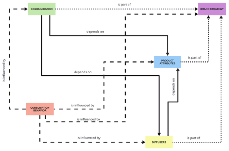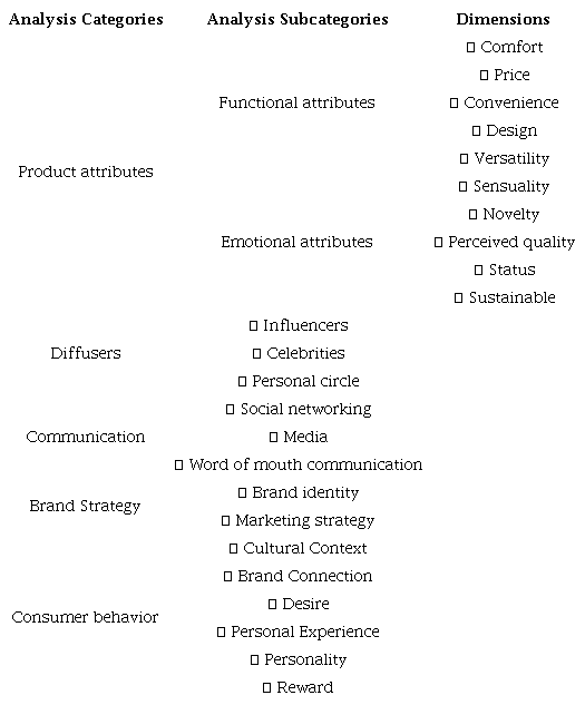 The model is formed by five categories: product attributes, diffusers, communication, brand strategy, and consumption behavior. The subcategories are divided into 16: functional attributes, emotional attributes, influencers, social circle, celebrities, social networks, media, word-of-mouth communication, brand identity, marketing strategy, cultural context, brand connection, desire, personal experiences, personality, and reward.
