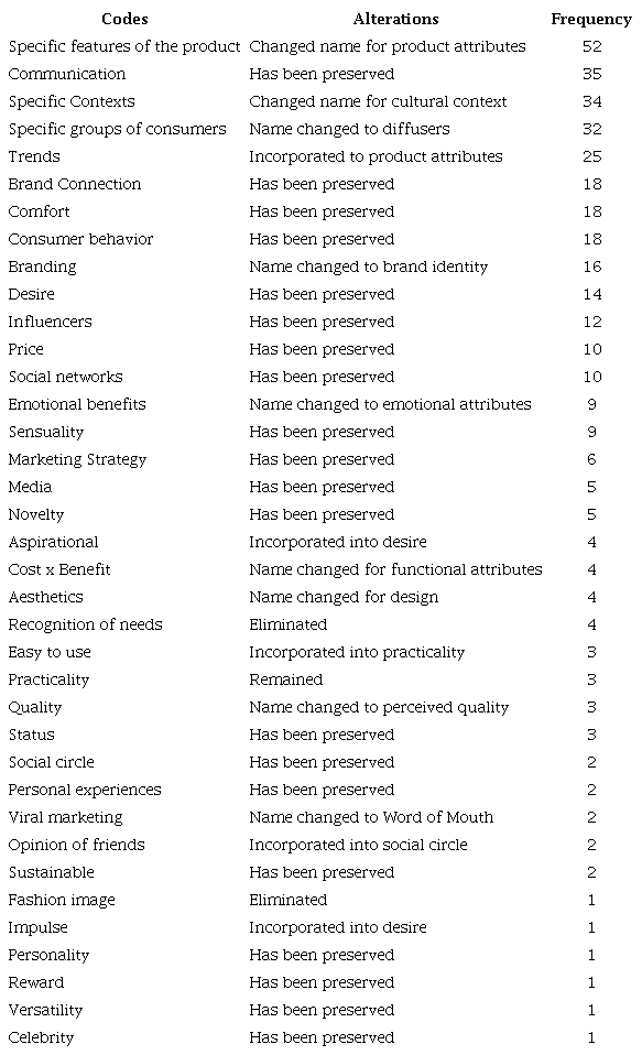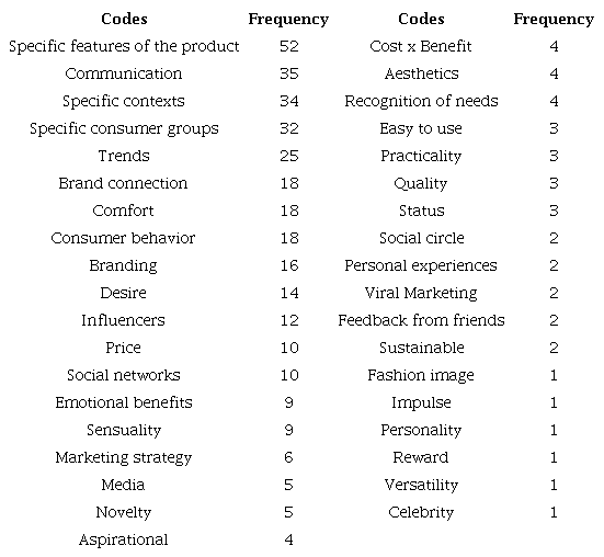 In the first level coding, the deductive analysis approach was used, where eleven codes were used from the indicators of the theoretical model initially proposed for the research and that are directly related to the factors responsible for the viralization of fashion products. In the open coding, 26 new codes emerged from the data through the inductive analysis, totaling 37. These new codes were created because they attributed meaning to important excerpts of the interview transcripts that had not been considered in the initial research model. Table I presents the inductive and deductive codes and their frequencies, i. e., the number of times the code was attributed to the quotes (important passages of the interviews).