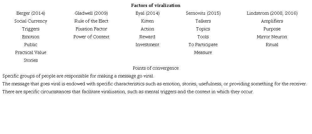 The authors emphasize the importance of specific groups in the viralization phenomenon, which was validated through the category diffusers. Specific product characteristics were corroborated with the product attributes category. Specific circumstances can be validated through the consumer behavior category.