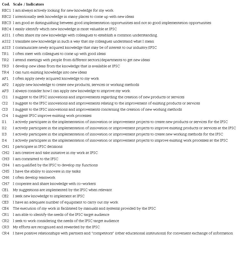 Regarding the absorptive capacity construct, we chose to use the Lowik, Kraaijenbrink and Groen (2016) model, in which the individual absorptive capacity is conceptualized as a multidimensional construct, which consists of individual activities of recognition, assimilation, transformation and application of new external knowledge. As with the intellectual capital instrument, localization was necessary for the context in which the research was applied.