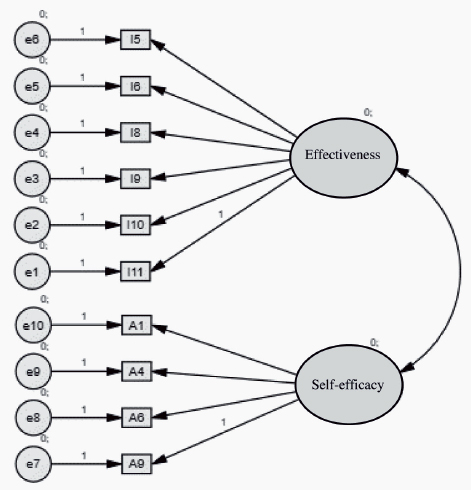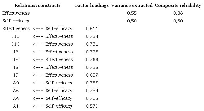 All the factor loadings extracted from the analysis conducted using Amos software were greater than 0.5. The measures of variance extracted were calculated for each construct, achieving values of 0.55 for training effectiveness at work and 0.50 for self-efficacy. The values for reliability of the construct, regarding internal consistency, were 0.88 for training effectiveness at work and 0.80 for self-efficacy. These values are higher than the minimum reliability standard of 0.7, in accordance with Hair et al. (2009).