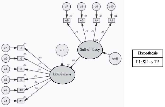 This study proposes a theory based on the organizational literature and the experience of cooperatives. The tested hypothesis is that self-efficacy (SE) affects training effectiveness at work (TE). The diagram of pathways of the proposed theory with the standardized factor loadings of the structural pathways, generated using AMOS software through likelihood estimation, is shown in Figure 3.