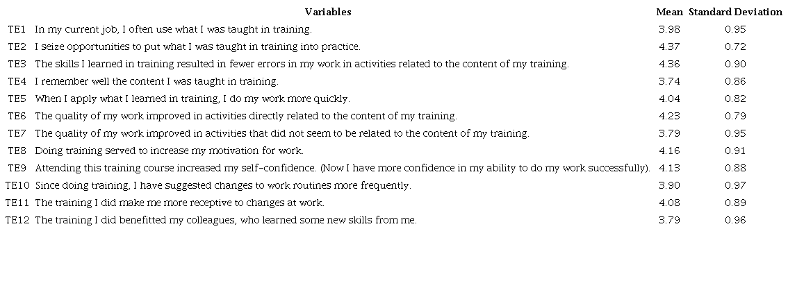 Table 1 shows the means of the responses to the questionnaires regarding the training effectiveness at work construct. Seven of the twelve variables had means higher than 4 points, i.e., between “I partially agree” and “I fully agree”. The variables in this construct list training as a factor that can directly influence the following aspects: faster execution of work, quality of work, motivation in work, self-confidence, proactivity and openness to change. Therefore, it can be said that the respondents agreed that training positively contributed to improving these six aspects.