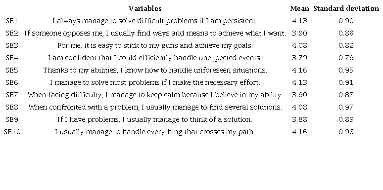 Although there are other types of scales (Chen, Gully, & Eden. 2001), the choice of General self-efficacy (GSE) is justified by the consistent evidence for associations between perceived self-efficacy and the variables under study, considering the universal construct that yields meaningful relations with other psychological constructs (Luszczynska, Scholz, & Schwarzer, 2005).