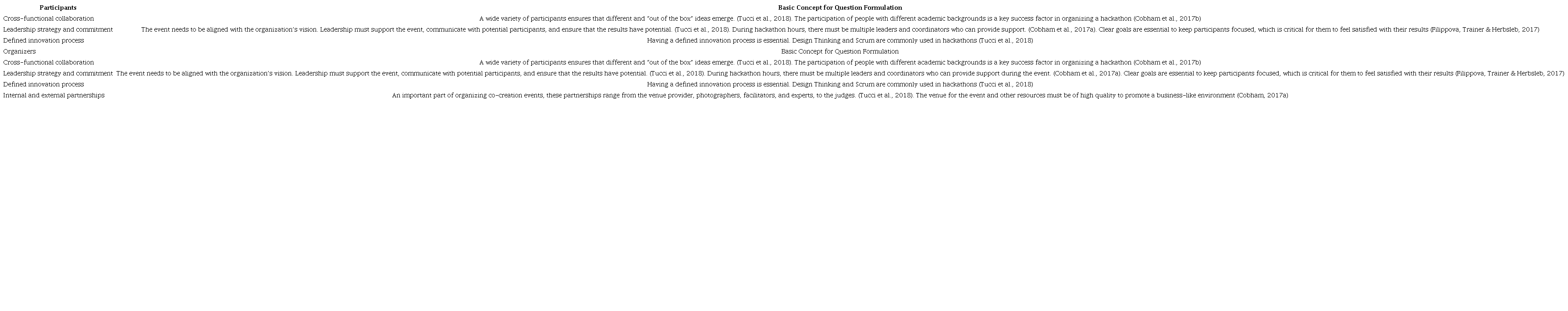 The sources of data collection used in this research were in-depth interviews and document analysis. To carry out the research, 12 interviews were carried out, six for each case, with participants and organizers of the two hackathons. The interviews were semi-structured, and two scripts were prepared, one for participants and the other for organizers. The scripts were developed from the theoretical review and involved the topics presented in Table 1. This table presents the concepts of study orientation, developed for an approach from two perspectives: the participants and the organizers of the hackathons: