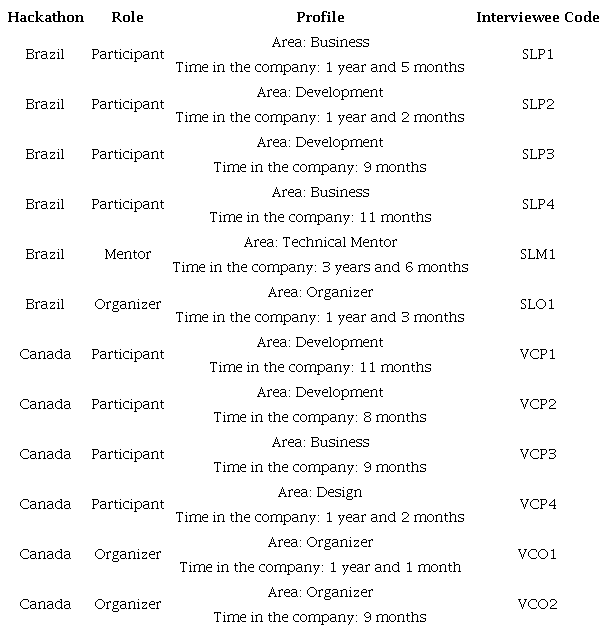 Invitations were sent to all the people who participated in the hackathons and were still working at the company at the time of the survey (March 2020). The interviews were scheduled as the participants responded, confirming their interest. All interviews were conducted remotely in April 2020. The interviews continued until information saturation was reached after the sixth interviewee in each case. To preserve the anonymity of each interviewee, a code was created for each of the respondents, indicated in Table 2, shown below: